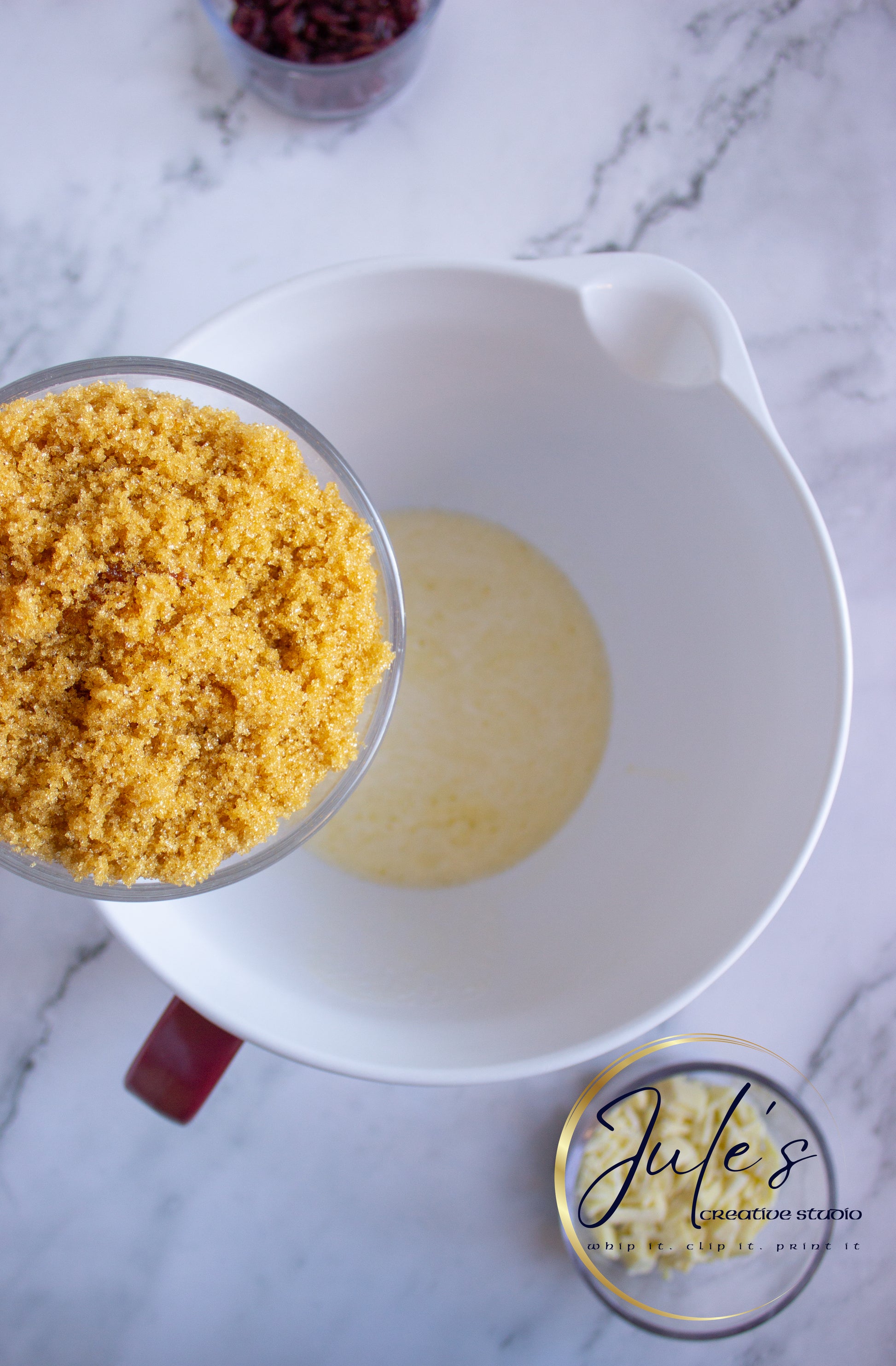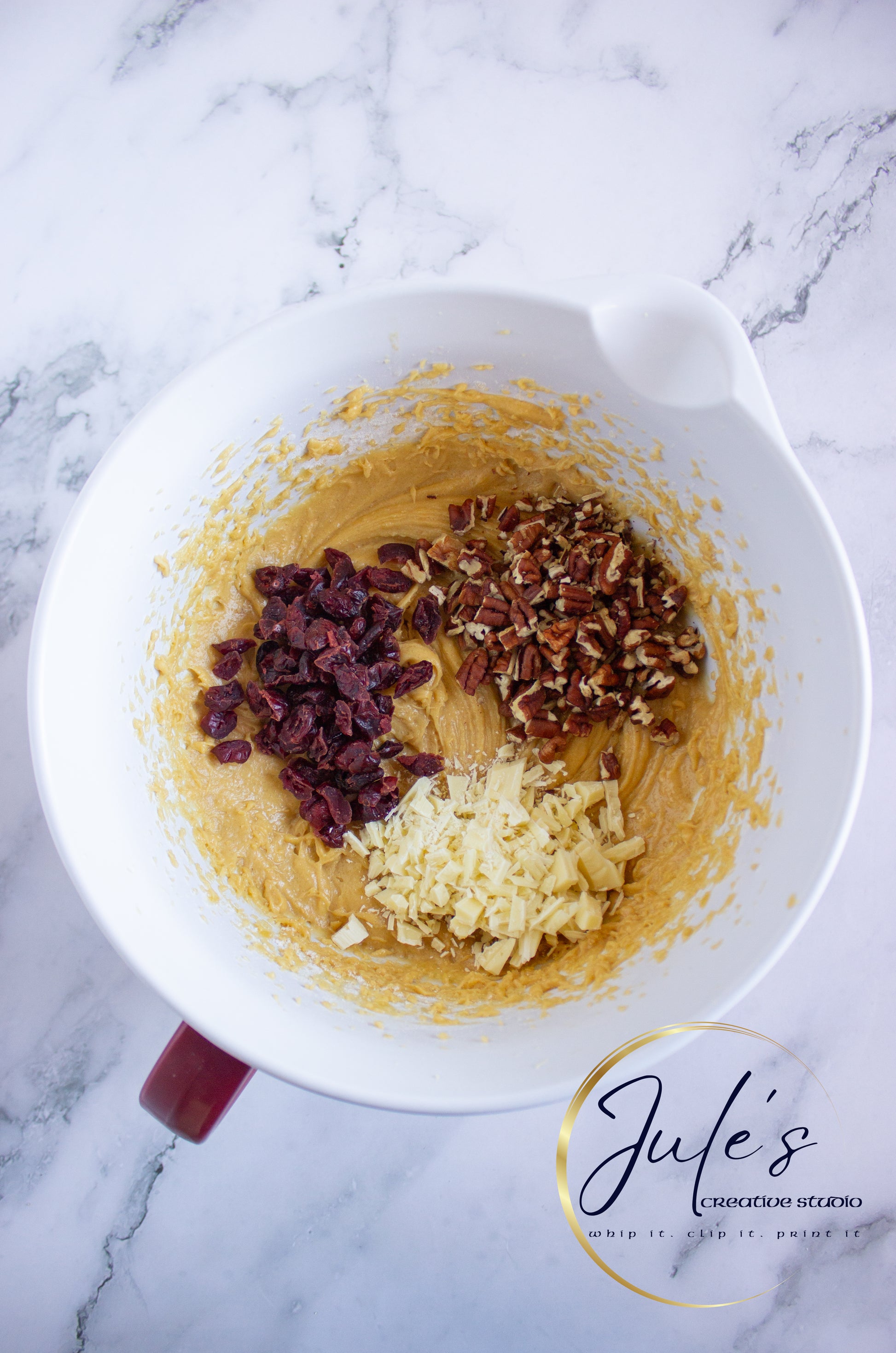 Ingredients: butter, brown sugar, eggs, vanilla extract, salt, all-purpose flour, baking powder, white chocolate, cranberries, chopped pecans, heavy cream, cream cheese, icing sugar.